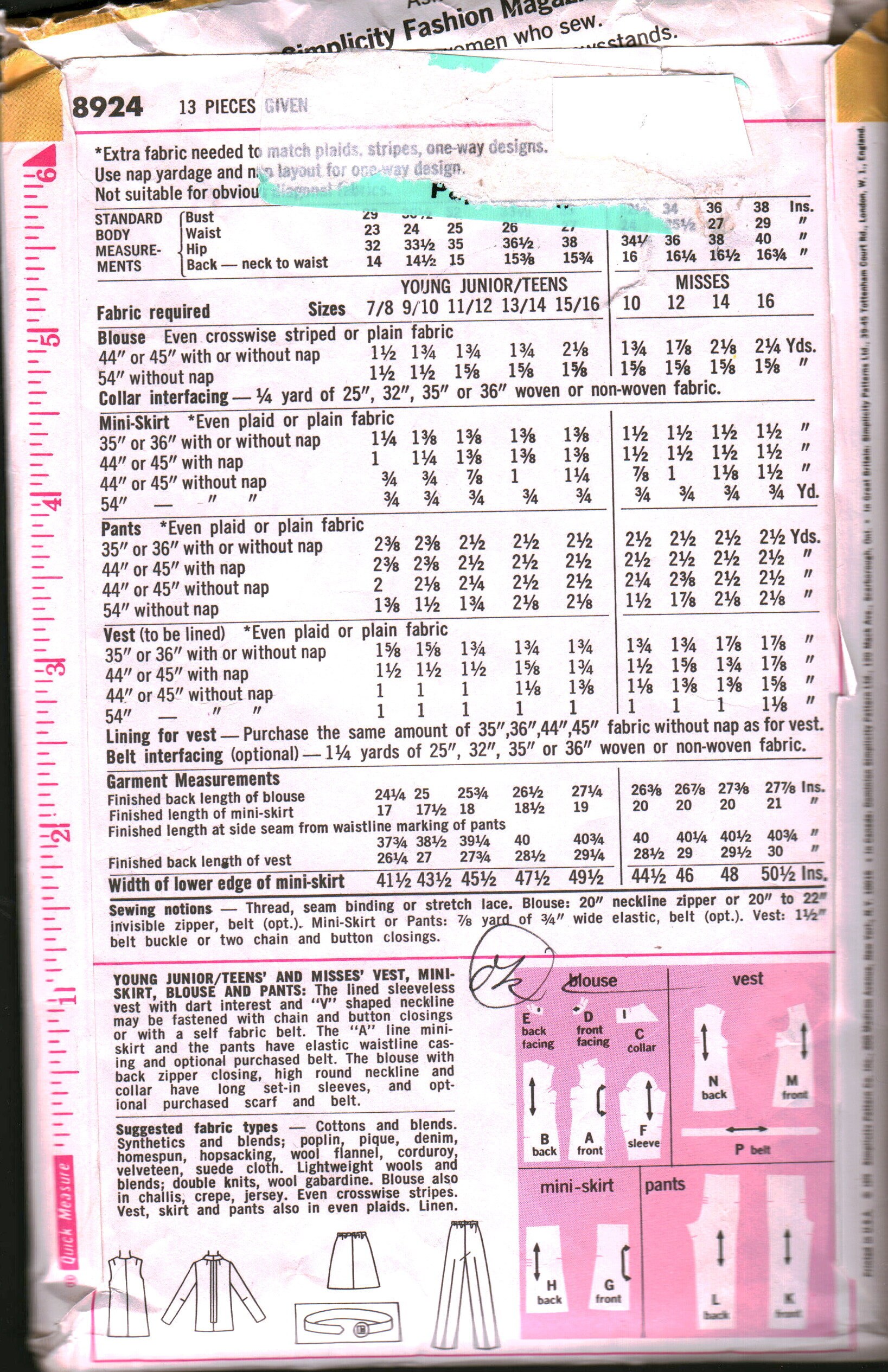 8924 Simplicity Vintage Sewing Pattern Teen Vest Mini Skirt Etsy